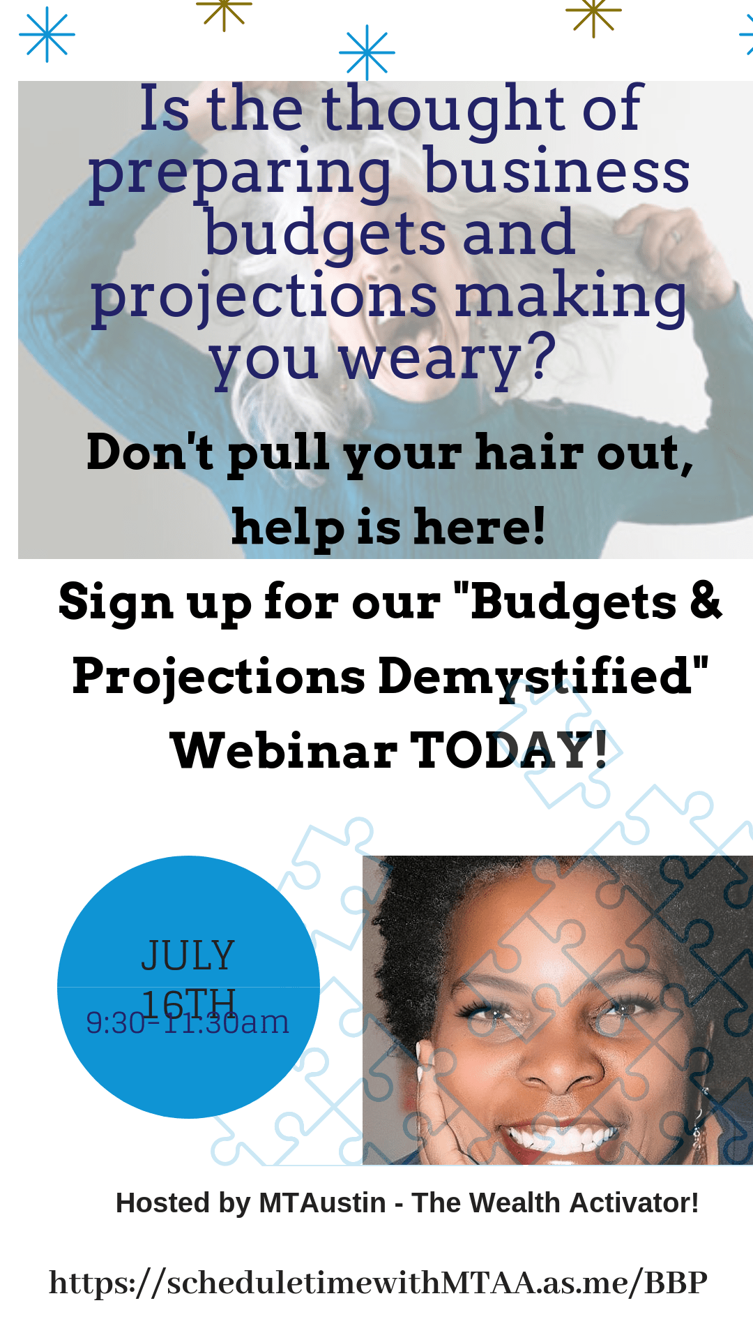 Happy July! MT Austin and Associates, LLC is offering a series of business and personal financial wellness workshops this month. The first is Budgets and Projections. As a business owner or Director of a non profit now is the time to start planning for a sustainable future. This is the only time this workshop will be offered at this price.